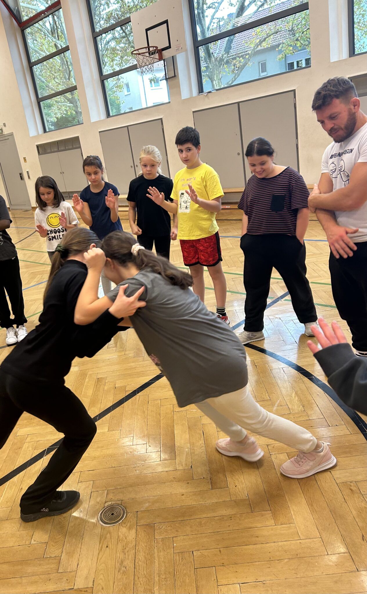 Am letzten Tag des Projekts durften wir dann richtig raufen, aber natürlich mit Regeln, damit nichts Schlimmes passiert. Wichtig war, dass wir uns nach dem Kampf die Hand gegeben haben, denn das ist auch ein Zeichen des Respekts.