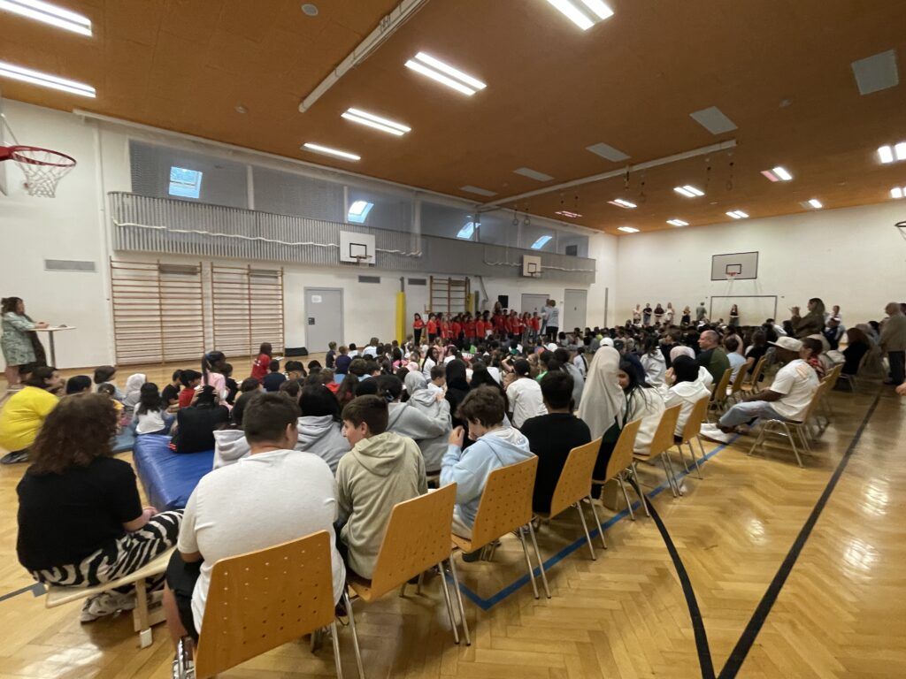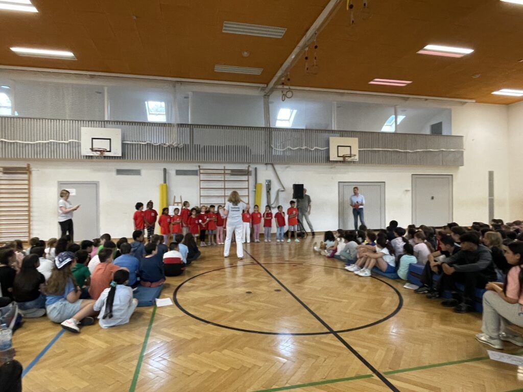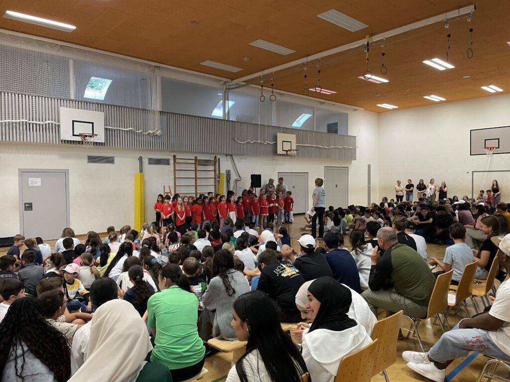 Nachdem Herr Gärthe am Ende noch unter großem Applaus „Eis für alle“ in der letzten Schulwoche versprochen hatte, wurde auf dem Pausenhof noch ein Abschlussfoto mit den Hauptakteuren der Veranstaltung gemacht.